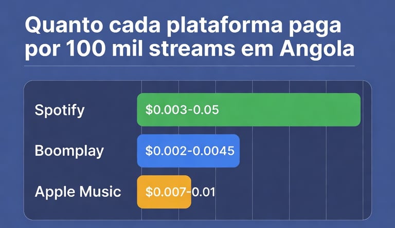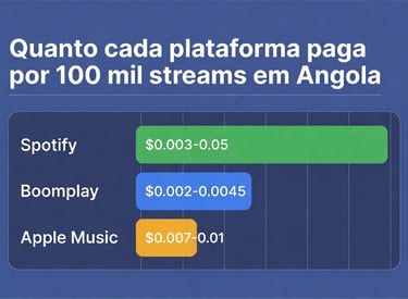 - Boomplay: o rei em Angola e África. Estimativa entre US$ 0,002 e US$ 0,004 por stream. Muitos artistas angolanos relatam que o Boomplay paga melhor que o Spotify para público local.